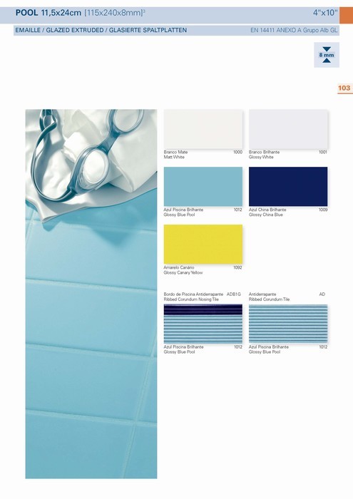Pool Branco Mate ; Pool Branco Brilhante ; Pool Azul Piscina Brilhante ; Pool Azul China Brilhante ; Pool Amarelo Canário ;
